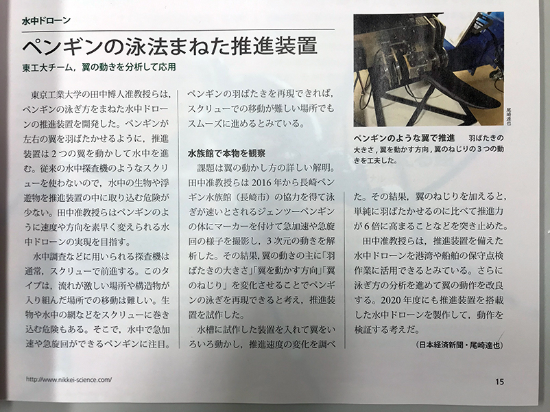 日刊工業新聞 朝刊28面 「東工大がペンギンロボ 羽ばたき遊泳、秒速1.8m」