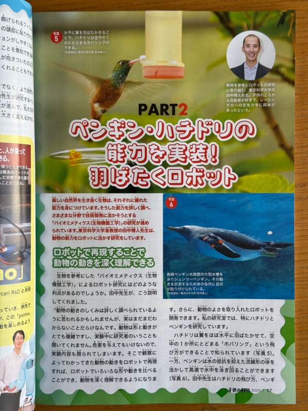 11月11日公開の論文 "Machine Learning-Based Wind Classification by Wing Deformation in Biomimetic Flapping Robots: Biomimetic Flexible Structures Improve Wind Sensing" について、プレスリリースしました。 - 12月10日【メディア】子供の科学2025年1月号