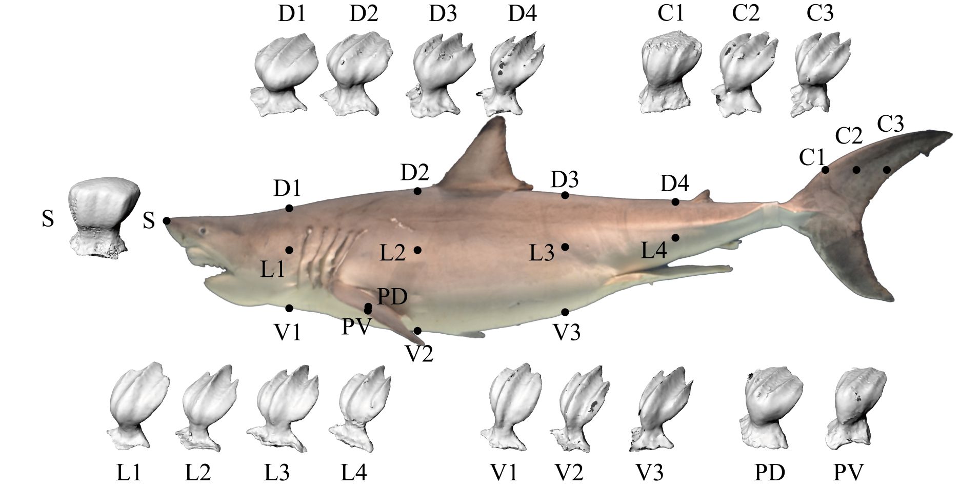 Paper: S. Sayama, M. Natsuhara, G. Shinohara, M. Maeda, and H. Tanaka, "Three-dimensional shape of natural riblets in the white shark: relationship between the denticle morphology and swimming speed of sharks," Journal of The Royal Society Interface, vol. 21, no. 217, 20240063, 2024, doi:10.1098/rsif.2024.0063.