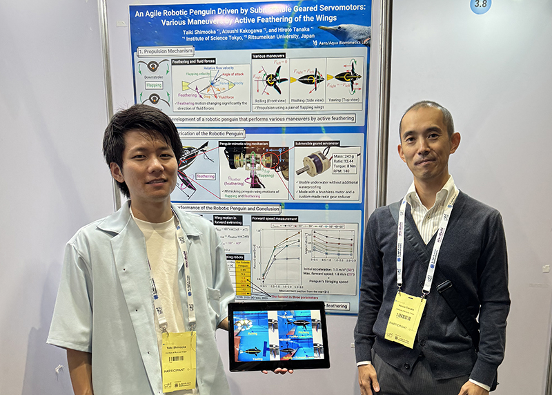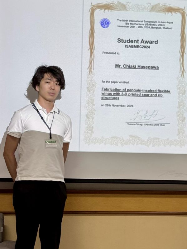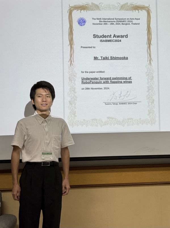 Taik and Chiaki (M2) received Student Award for their excellent presentation at ISABMEC 2024. Conglaturation!T. Shimooka, A. Kakogawa, and H. Tanaka, "Underwater forward swimming of a robotic penguin by flapping wings," in The 9th International Symposium on Aero Aqua Bio-Mechanisms, Kasetsart University, Bangkok, Thailand, 26–28 November 2024, pp. 118–121.
