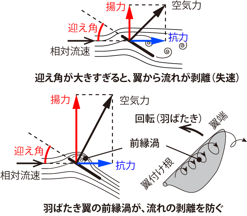 じつは翼が小さいほど、空気の粘性が空気の慣性に対して相対的に強くなり、翼が形成する渦は相対的に大きく顕著になる。さらに、翼が薄くて前縁が鋭いと、大きな迎え角の時に前縁が強い渦を形成する。この前縁渦が翼面上に留まっている短い時間は、そのまわりの流れも翼から剥がれず、大きな揚力が発生する。しかし、やがて前縁渦は後方に流れ去ってしまい、流れが翼から剥がれて揚力は小さくなる(図2左上)。ところが小さな翼が回転する(羽ばたく)ときは、前縁渦がらせん状になって翼面上に長く留まり、そのまわりの流れは翼から剥がれず、大きな揚力が維持される(図2右下)[16](Sane, 2003)。