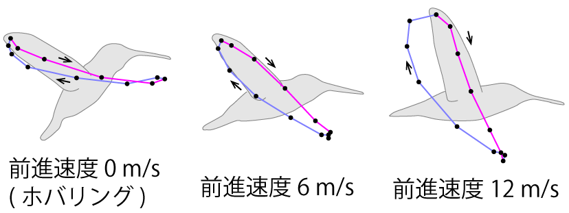 アカフトオハチドリでの同様の実験[10](Tobalske et al., 2007)では、秒速12m(時速43km)まで飛行できた。このときの体の姿勢は、ホバリング中は体軸が水平から50°の角度で前傾して立ち、速度が速くなるほど前傾が深くなり、最高速ではほぼ水平(水平からの角度13°)になった。逆に、横から見た翼端の軌跡は、ホバリング中は水平から15°だったのが、速度が速くなるほど立ち上がり、最高速では水平から68°に立ち上がった(図3)。なお、「ハチドリの翼端は8の字(∞)を描く」としばしば言われるが、図3に見られるように、必ずしも8の字は描かない。
